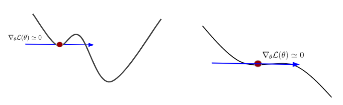왼쪽 그림과 같이 극값이 두개 이상인 경우 더이상 업데이트가 되지 않으면 Global minima를 찾을 수 없고, 안장점(saddle points)에 앉아버려 더 움직이지 못하는 경우도 있습니다.