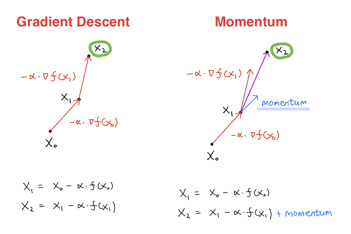Gradient Descent Optimizer보다 개선된 알고리즘으로 이동 값에 관성으로 인한 업데이트가 추가된 Otimizer입니다.