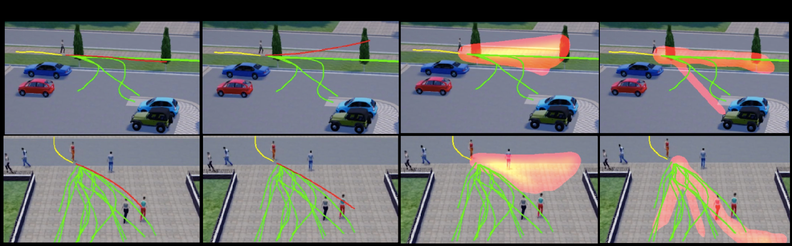 위 그림에서 빨간색 박스쳐진 에이전트를 관찰해보면 사람들을 피하여 여러 갈래의 길로 이동한다. 이렇게 에이전트의 여러가지 경로를 예측하는 것이 이 연구의 목적이다.