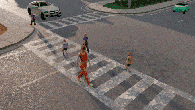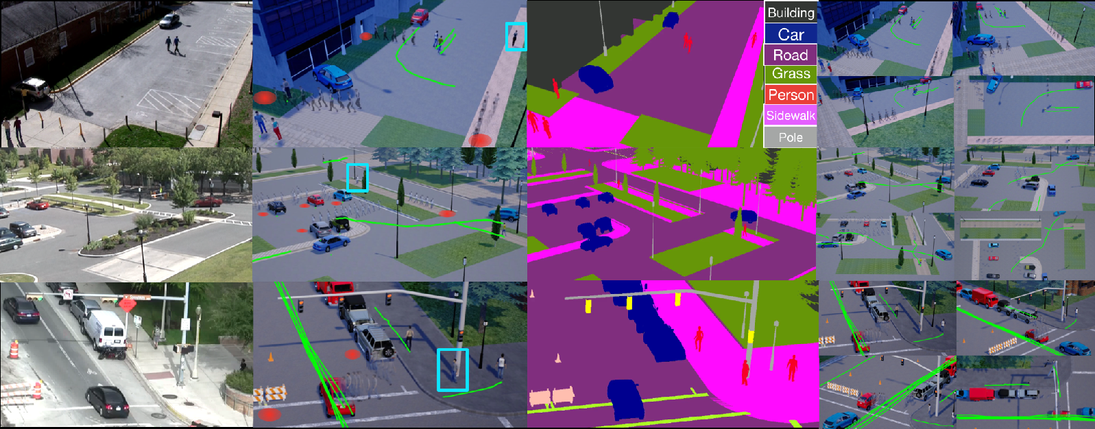 실제 환경을 바탕으로 CARLA 시뮬레이터에 나타냈다. CARLA는 실제에 가까운 오픈소스 시뮬레이터로 Unreal Engine4 위에 구축되었다. 앞선 데이터셋에 따라, ETH/UCY and VIRAT/ActEV으로 된 실제 동영상을 활용하여 반자동적으로 정적 장면과 동적 요소들을 반자동적으로 재건축 가능하다. 이동수단과 보행자의 역동감 있는 움직임을 위해서, 우선적으로 정답 경로 주석을 실세계의 비디오(제공된 homography matrices 사용)에서 ground plane으로 변환했다. 그럼으로써 우리는 실제 경로를 재구성한 장면들의 올바른 위치로 매칭시킬 수 있다.