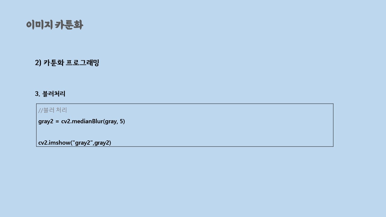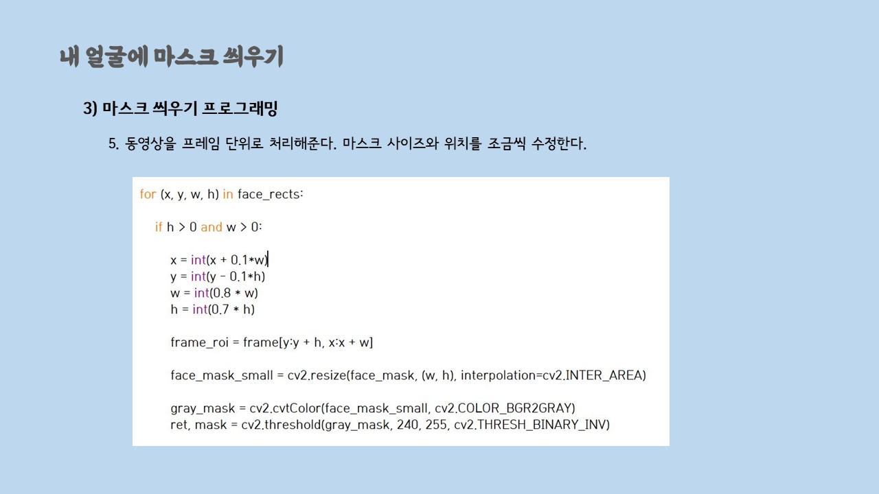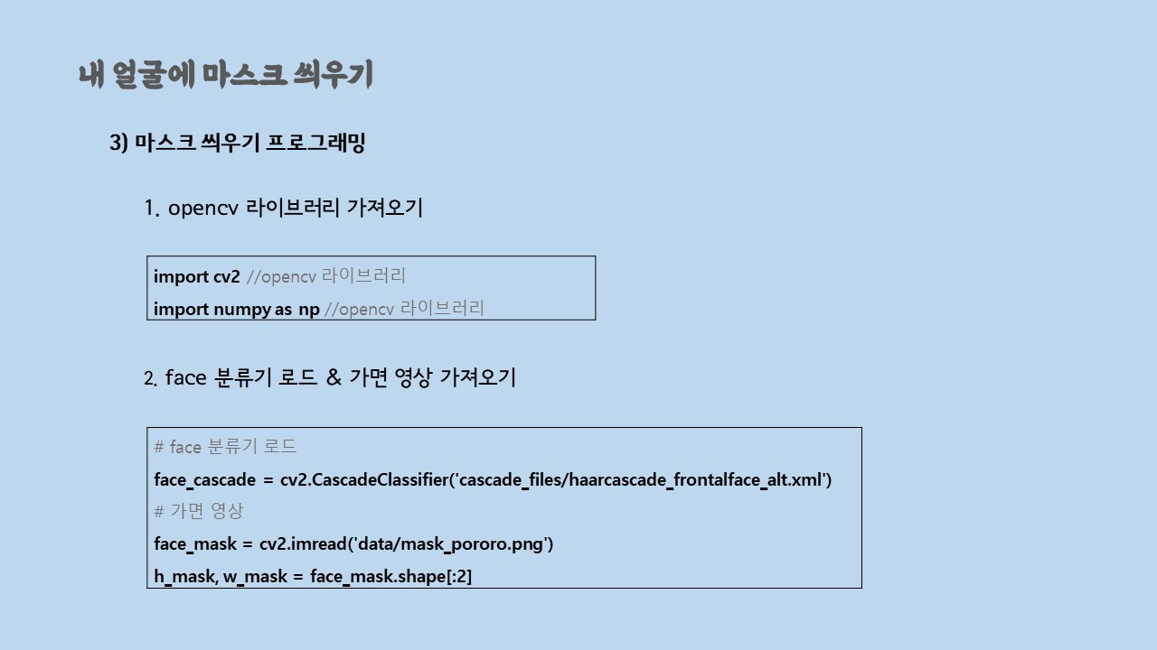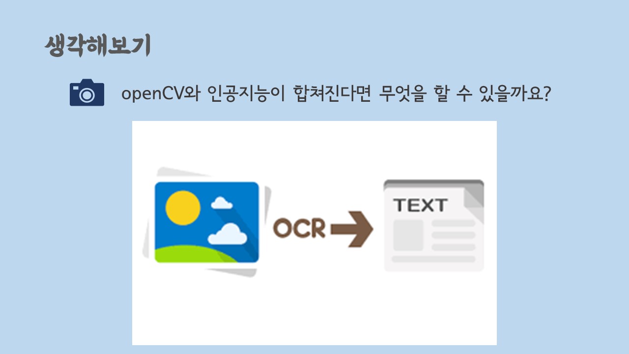 주제는 코딩을 직접 해볼 수 있고 바로 시각적으로 보여 흥미를 가질 수 있을 것이라 생각하여 "opencv"로 정했습니다. 직접 자신의 스마트폰으로 찍어 컴퓨터에 저장한 뒤 적용해보면 좋을 것 같아서 <나만의 필터카메라 만들기>라는 이름을 붙여보았습니다.