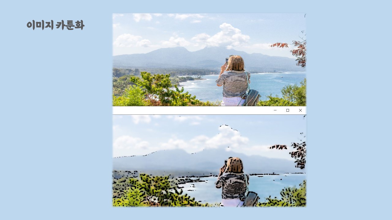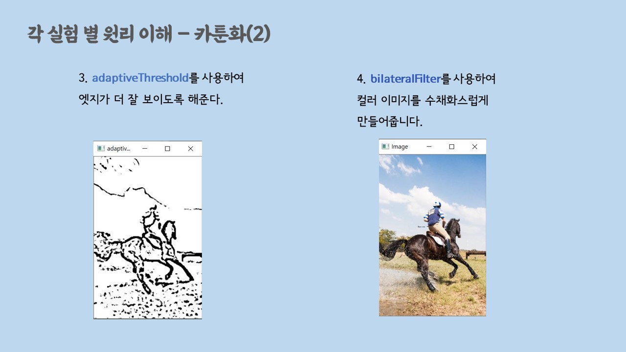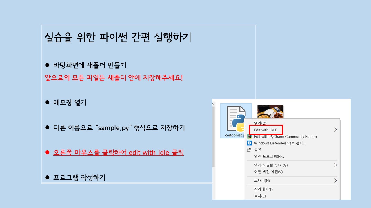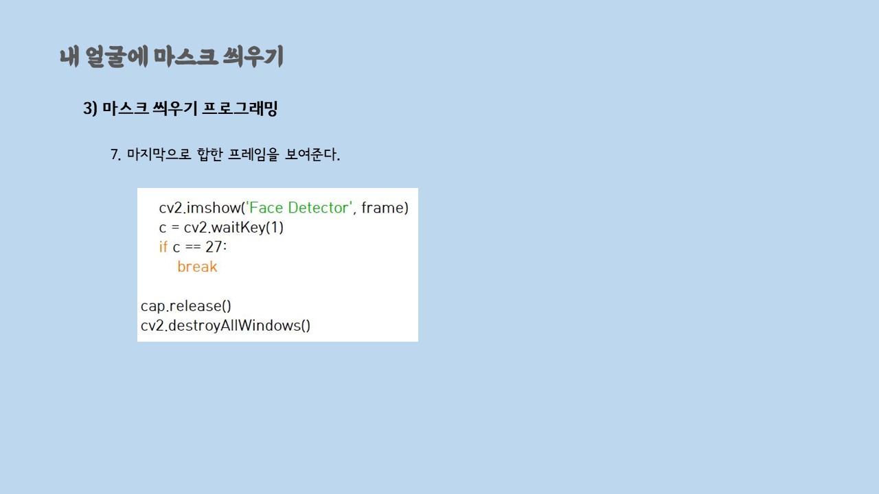 주제는 코딩을 직접 해볼 수 있고 바로 시각적으로 보여 흥미를 가질 수 있을 것이라 생각하여 "opencv"로 정했습니다. 직접 자신의 스마트폰으로 찍어 컴퓨터에 저장한 뒤 적용해보면 좋을 것 같아서 <나만의 필터카메라 만들기>라는 이름을 붙여보았습니다.