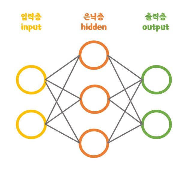 인공신경망은 다음과 같이 입력층(input layer), 은닉층(hidden layer), 출력층(output layer)으로 되어있습니다.