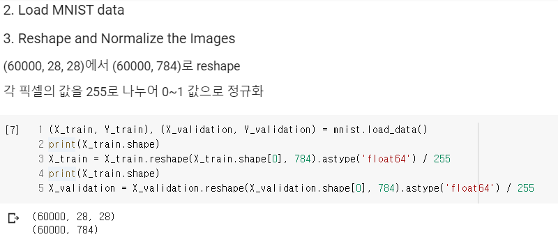 28x28 사이즈의 정사각형 이미지를 784 사이즈 즉, 한줄로 쭉 바꾸어 준 것이다.