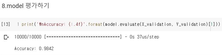 마지막으로 evaluate 메소드로 학습한 모델이 잘 학습되었는지 validation data를 활용해 평가해본다.