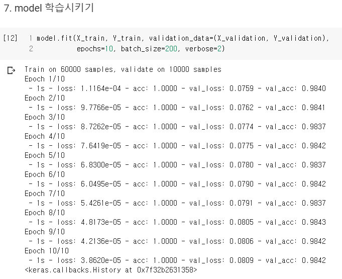 인수로는 Train data와 그에 대한 정답, Validation data와 그에 대한 정답, 학습 횟수, 배치 사이즈, verbose를 넣어준다.