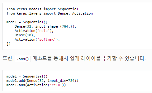 이제 생성자 model에 add 메소드를 사용해 layer를 쌓아준다.