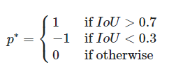 분류 기준은 어떤 anchor가 ground truth box와 오버랩되는 부분이 크냐이다. 오버랩되는 부분이 크면 foreground(object)이고 적으면 background(객체 아님, 배경)이다. 각각의 anchor마다 foreground인지 아니면 background인지 구별하는 값을 p* 값이라고 했을 때 공식은 다음과 같다.