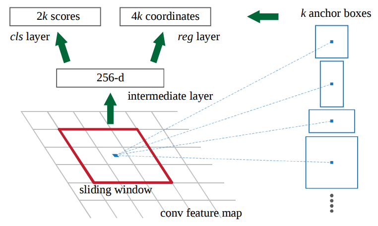 sliding window가 영상의 위로 overlap되고 이 window 안에 여러 개의 region proposals을 찾고 9개의 anchor boxes를 뽑아낸다.