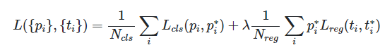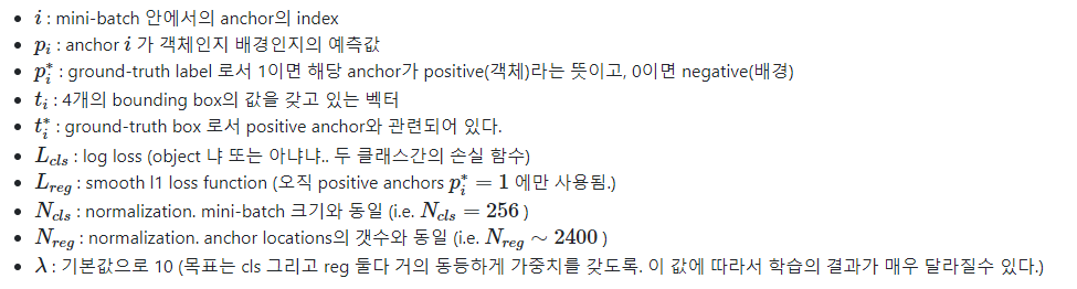 분류 기준은 어떤 anchor가 ground truth box와 오버랩되는 부분이 크냐이다. 오버랩되는 부분이 크면 foreground(object)이고 적으면 background(객체 아님, 배경)이다. 각각의 anchor마다 foreground인지 아니면 background인지 구별하는 값을 p* 값이라고 했을 때 공식은 다음과 같다.
