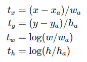 bounding box regression에는 4개의 좌표값을 사용한다. t라는 값 자체가 4개의 좌표값을 갖고 있는 하나의 벡터라고 보면 된다. 다음과 같은 element 값을 가지고 있다.