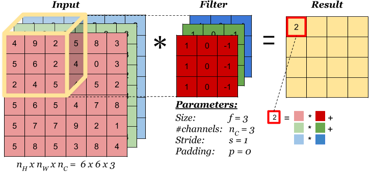 대부분의 영상인식 알고리즘에는 특징을 추출하기 위해 filter를 사용한다. 보통 필터는 5x5 혹은 3x3과 같은 작은 영역(receptive field)에 대해 적용하며 필터에 사용에는 계수들의 값에 따라 다른 특징을 얻을 수 있다. (opencv 실습을 해보면 알 수 있음)