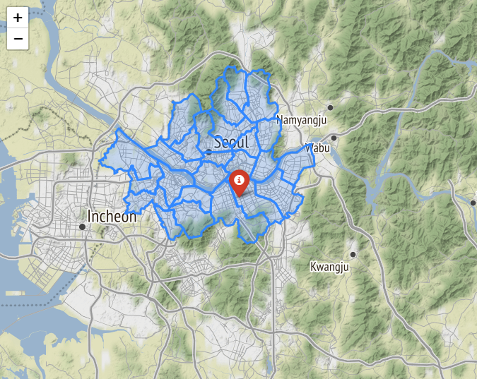 나중에 지도에 데이터를 분석하여 시각화하기 위해 folium 모듈을 사용해보았다. 깃헙에서 json파일을 다운받을 수 있다. https://github.com/southkorea/seoul-maps southkorea/seoul-maps Seoul administrative divisions in ESRI Shapefile, GeoJSON and TopoJSON formats. - southkorea/seoul-maps github.com 1 2 3 4 5 6 7 8 9 10 11 12 13 14 15 16 17 import googlemaps import folium from datetime import datetime import json map_osm=folium.Map(location=[37.50..