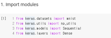 Digit MNIST 이미지 분류하기 일단 필요한 모듈을 임포트한다. keras에서 제공되는 기본 데이터셋 중 mnist 손글씨 0~9까지 분류해보려고 한다. mnist 데이터를 로드하면 4개의 반환값이 나온다. 각각 X train, Y train, X validation, Y validation이다. X는 데이터 0~9까지 이미지를 뜻하고 Y는 그 이미지에 대한 정답이다. shape을 출력한 것을 보면 28x28 사이즈의 이미지가 60,000장 있다는 것을 알 수 있다. X_train의 이미지들을 학습시키기 위해 reshape 해준다. 28x28 사이즈의 정사각형 이미지를 784 사이즈 즉, 한줄로 쭉 바꾸어 준 것이다. 또 astype으로 float64로 자료형을 바꾸어주고 255로 나누어 norma..